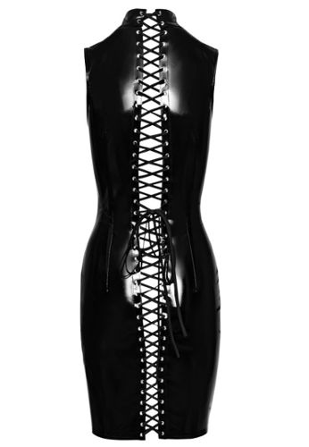 Robe courte en similicuir élastique au fini mat, avec empiècement en résille au décolleté. Coupe tour de cou, dos nu et fines bretelles pour une allure BDSM chic.