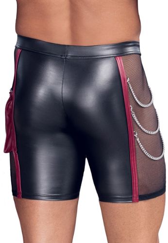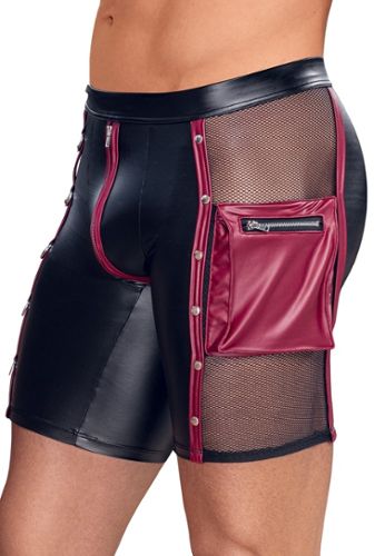 Diese langen Boxershorts schwarz matt überschreiten die Grenzen des Fetisch-Stils. Seitliche Netzeinsätze, rote Kontrastdetails und silberfarbene Accessoires. Verborgener Reißverschluss im Schritt, Ringe mit 3 abnehmbaren Karabinerketten auf einer Seite, Cargotasche mit Reißverschluss auf der anderen. Bedeckter elastischer Bund für maximalen Komfort.