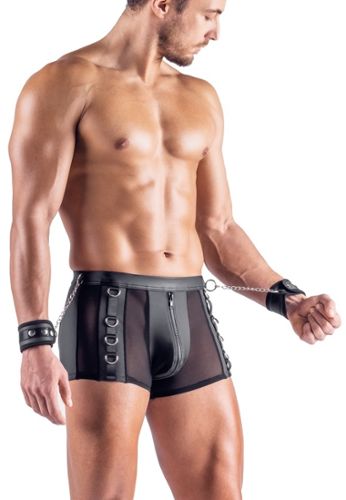 Diese offenen schwarzen Boxershorts überschreiten die Grenzen des Bondage. Mix aus Netz und mattem Schwarz mit metallischen Details, Reißverschluss in der Tasche. Enthalten: weiche Handschellen mit Ketten. Befestigungsringe am Bund und an den Seiten, verstellbare Klettband-Manschetten für maximale sinnliche Erkundung.