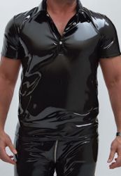Poloshirt aus glänzendem schwarzem Vinyl mit kleinen Ärmeln.