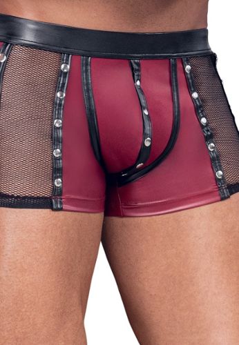 Diese roten matten Boxershorts verbinden Kühnheit und Raffinesse. Seitliche Netzeinsätze, schwarze Kontrastdetails und dekorative silberfarbene Nieten. Verborgene Druckknöpfe im Schritt für diskreten Zugang. Bedeckter elastischer Bund, weiches und elastisches Material für maximalen Komfort.