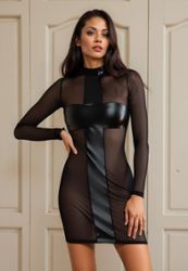 Dieses Wetlook-Tüllkleid verkörpert die Kunst der modernen Verführung mit kontrollierter Kühnheit. Der auffällige Kontrast zwischen dem weichen, halbtransparenten Tüll und den glänzenden Wetlook-Paneelen schafft ein fesselndes visuelles Spiel, das mit kalkulierter Sinnlichkeit enthüllt und verbirgt.