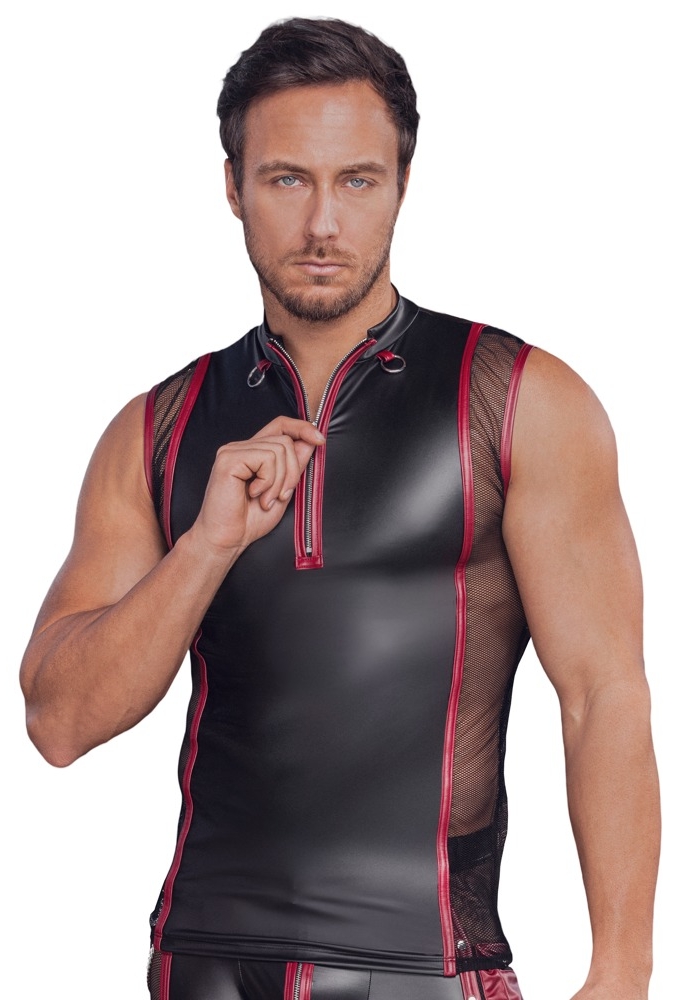 Ein ärmelloses Shirt schwarz matt mit kühnem Fetisch-Design. Enge Schnittführung, rote Kontrastdetails und silberfarbene Accessoires. Stehkragen mit dekorativen Ringen, kurzer Vorderreißverschluss und seitliche Netzeinsätze. Material weich und elastisch für maximalen Komfort.
