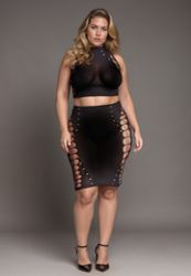 Este conjunto é composto por um top ultra-sexy em malha opaca, com aberturas laterais e uma gola Mao ligeiramente alta.