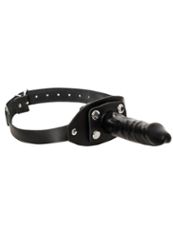 Δύο αξεσουάρ, ένα ενιαίο κομμάτι και μια πολύ ξεκάθαρη πρόθεση: αυτό το gag με dildo συνδυάζει τη σιωπή και το παιχνίδι διείσδυσης σε ένα διεκδικητικό φετιχιστικό πνεύμα. Ο ρυθμιζόμενος μαύρος δερμάτινος ιμάντας κεφαλής συγκρατεί ένα φίμωτρο datex (σχήμα πέους με διαμορφωμένη γλωσσίδα), στο οποίο προσαρτάται ένας αποσπώμενος εξωτερικός δονητής με πιεστικά καρφιά. Το φίμωτρο και ο δονητής μπορούν επίσης να χρησιμοποιηθούν ξεχωριστά, για να ποικίλουν τα σενάρια: περιορισμός, πειράγματα, κυριαρχία ή πιο άμεσες "στιγμές ώθησης" - πάντα μέσα σε ένα συναινετικό και ελεγχόμενο πλαίσιο.