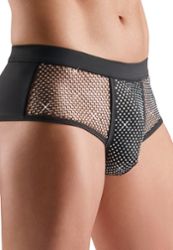 Τα διαφανή δίχτυα εμπρός είναι επίσης καλυμμένα με στρας, προσθέτοντας μια πινελιά σεξουαλικότητας και πολυτέλειας. Αυτό το μίγμα υλικών (αδιαφανής ύφασμα, διαφανές δίχτυ, στρας) δίνει στο εσώρουχο ένα μοναδικό χαρακτήρα, ταυτόχρονα σέξι και εκλεπτυσμένο.