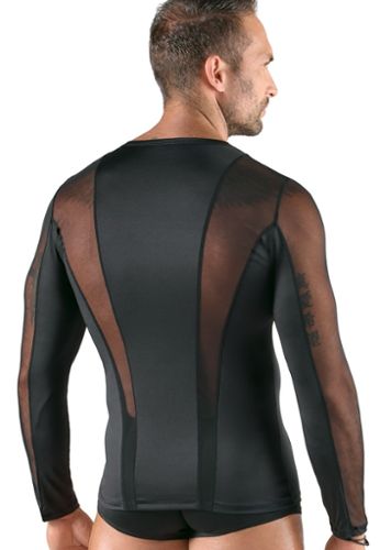 Αυτό το επαναστατικό ανδρικό μακρυμάνικο T-shirt παίζει με την εντυπωσιακή αντίθεση μεταξύ του διαφανούς διχτυωτού και του ελαστικού αδιαφανούς υφάσματος.