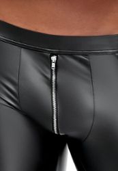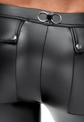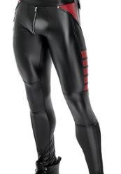 Tight pants in a matte black look with red contrasts and striking rivet and ring details. Transparent mesh yoke at the bottom of each leg. With a soft, covered elastic waistband and all-around elastic for great comfort. Zipper under front. 2 patch pockets with flaps at back.