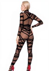 Questa tuta di ispirazione Shibari si abbina perfettamente ad accessori in pelle o metallo per creare un look fetish sofisticato.