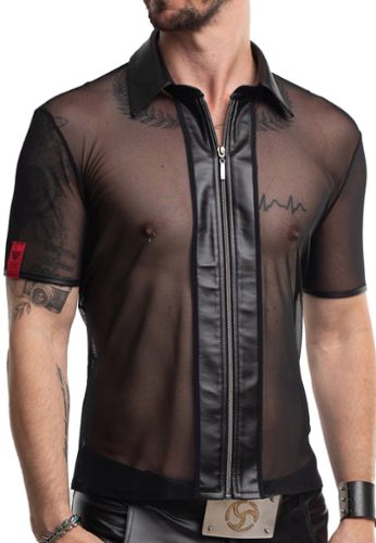 A polo shirt in fine transparent black mesh with stand-up collar in wetlook and slim-fit cut. Piece in transparent mesh 95% polyester 5% elastane with stand-up collar black wetlook and red Alcantara patch engraved RFP by Regnes Fetish Planet brand, exclusive design made in Europe.