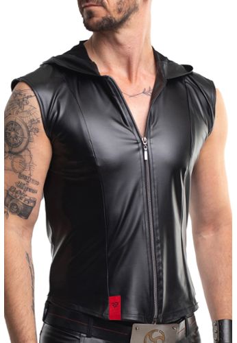 A sleek sleeveless vest in elastic matte wetlook (quality vegan faux leather). Piece with 2-way zipper engraved with RFP logo, vertical slimming seams, signature red Alcantara label, for a sublime silhouette, perfect for fetish appreciation and sensual elegance.