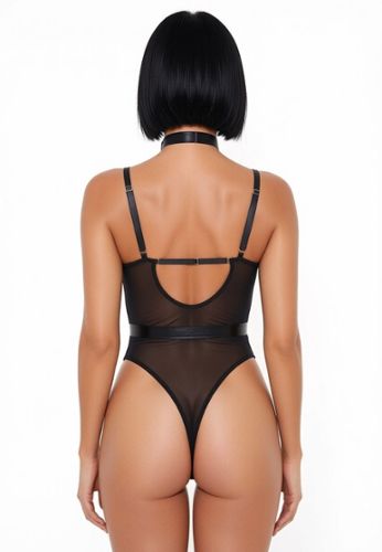 The Evianne bodysuit reveals your most daring side with its fine elastic fishnet and structuring underwire. Its satin stripes create a captivating harness, while the chain sensually links the bodysuit to the included choker for a unique look.