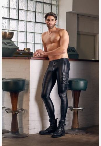 Elastic faux-leather pants with a decidedly biker look.