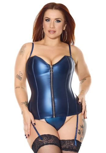 The Midnight set is a statement of luxury: a structured corset with premium boned seams, front nylon separating zipper, and ribbon lace-up back for customizable cinching. Removable straps and garters let you style it your way, and the matching G-string with adjustable straps is finished with sleek silver-tone hardware. Available in plus size and standard.