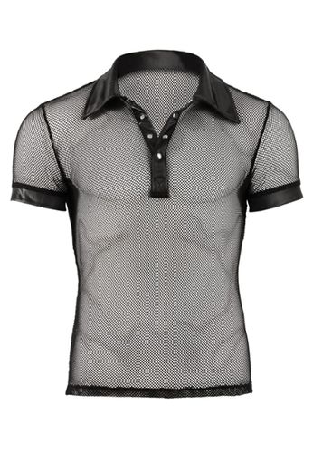This revolutionary men's long-sleeved t-shirt plays on the striking contrast between transparent fishnet and opaque stretch fabric.