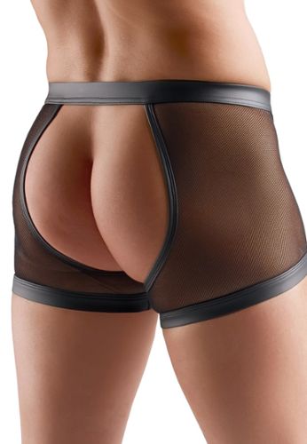These open back black boxer shorts push the boundaries of bondage. Mix of mesh and matte black with metallic details, zipper at pouch. Included: soft handcuffs with chains. Restraint rings at waistband and sides, adjustable velcro cuffs for maximum sensual exploration.