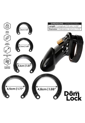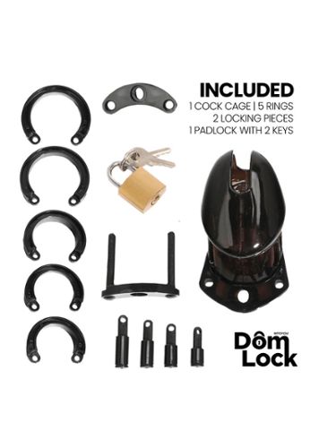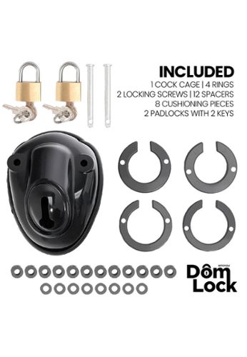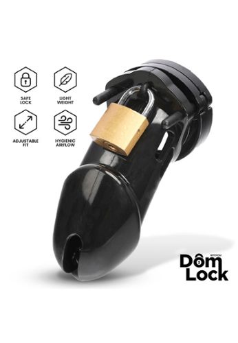 The Domlock Sentence is a black penis cage designed for long wear, balancing comfort and functionality. Its design supports hygienic airflow, and the quality locking mechanism enables erotic, effective, controlled play.