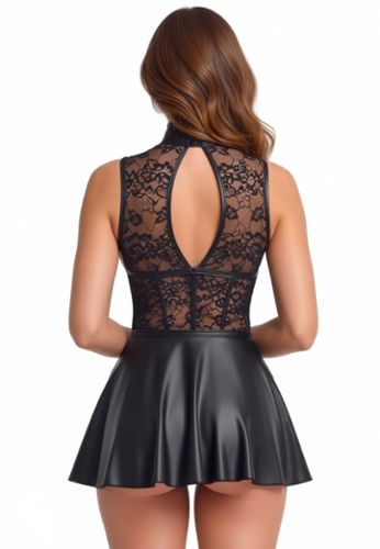 An open-bust mini dress with a premium mix: close-fitting lace top, matte-effect finish framing the bust, decorative center ring, stand-up collar with neck closure and deep back neckline. Soft, stretchy and highly visual.
