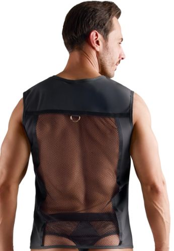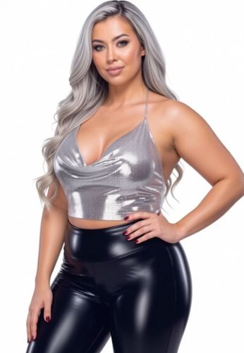 A glamorous metal crop-top: waterfall-effect draped neckline, adjustable chain neckholder and adjustable halter chain with snap hooks. Soft to wear, highly visual, perfect for an elegant fetish look.