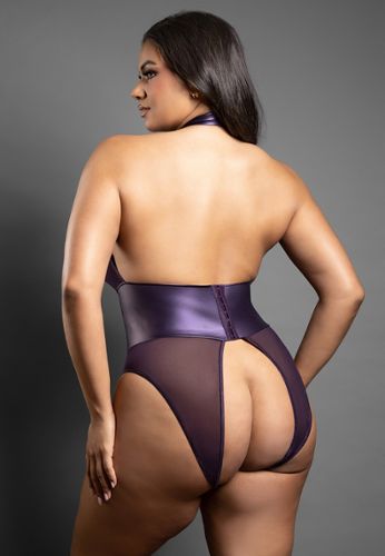 A purple teddy in a truly original shade, with a halter neckline in mesh and leatherette, made for elegant yet bold provocation. The extra wide high-waist lace-up belt steals the spotlight and shapes the silhouette, while the cut is open at the crotch and at the back. The matching blindfold completes the game.