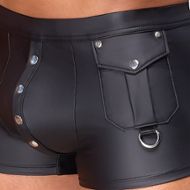 Pants designed to emphasise the male silhouette. Piece in black matte look with press studs over the pouch, two front pockets and decorative D-rings for a structured and comfortable BDSM look.