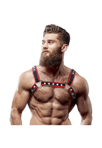 The Bulldog black/red is a men’s chest harness in eco vegan leather, built for extra visual impact with a two-tone contrast. One size and fully adjustable, it shapes the torso and delivers a clean, premium statement look.