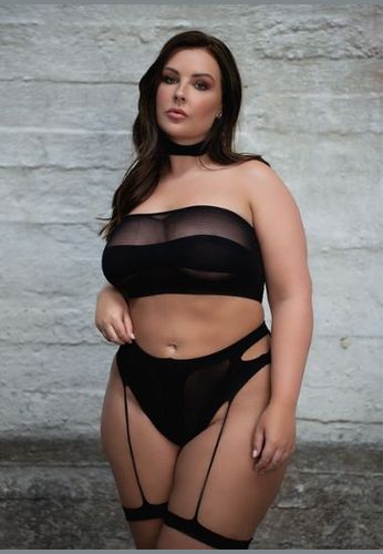 A black lingerie mini dress in fine mesh, featuring a built-in matte leatherlook chest harness with silver-tone rings for a sharp, graphic line. The set includes a rio thong in matte leatherlook, extra high-cut for an ultra sexy silhouette. Soft, stretchy, and comfortable to wear.
