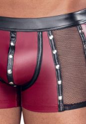 Boxer shorts with bold fetish design, perfect for those seeking a unique and provocative style. The red matte creates a dynamic and sensual foundation, enhanced by black contrast details and decorative silver rivets.