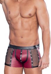 These red matte boxer shorts combine boldness and sophistication. Side mesh inserts, black contrast details and decorative silver rivets. Hidden snap buttons at the crotch for discreet access. Covered elastic waistband, soft and elastic material for maximum comfort.