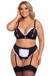 An open-style 2-piece "service" set: split bra and straps-string, with ruffled trim, decorative bows and mini apron. Removable beaded chain at crotch and adjustable/removable suspenders for precise, confident wear.