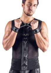 This sleeveless black mesh tank top pushes the boundaries of bondage. Soft elastic mesh with matte black inserts and metallic details. Included: soft handcuffs with carabiner chains. Restraint rings front and back, adjustable velcro cuffs for maximum sensual exploration.