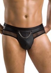 An open black jockstrap that steals the spotlight: graphic mesh, intense faux leather, and a metal chain at the front. Butt bare, flexible comfort, ultra sexy vibe.