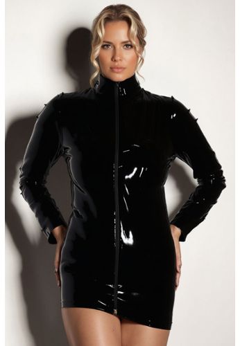 Discover our high-neck natural latex dress, a sophisticated reinterpretation of the little black dress in the fetish world.