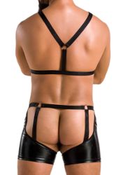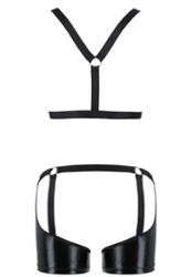 Este conjunto wetlook de 2 piezas redefine los códigos de la lencería fetichista con sus aberturas estratégicas totales. El top y los shorts, unidos por tirantes elásticos de alto rendimiento, ofrecen un acceso total al tiempo que mantienen una impecable estética BDSM.
