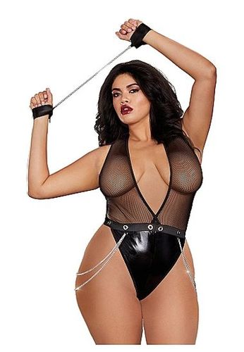De Evianne bodysuit laat je van je meest gedurfde kant zien met het fijne elastische visnet en de structurerende beugel. De satijnen strepen creëren een fascinerend harnas, terwijl de ketting de bodysuit sensueel verbindt met de bijgeleverde choker voor een unieke look.