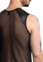 Una camiseta moderna en malla transparente negra con insertos de cuero sintético en hombros y pecho. Pieza en malla elástica transparente con detalles de cuero sintético y logo RFP de la marca Regnes Fetish Planet, diseño exclusivo fabricado en Europa.