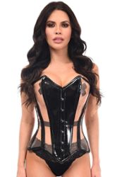 Este corsé overbust combina vinilo negro brillante y mesh transparente para un look súper sexy, original e irresistible. Realza el busto, define la cintura y atrae todas las miradas.