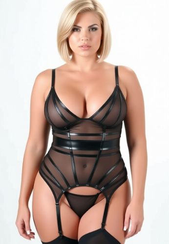 Un bustier de rejilla transparente estructurado con bandas de vinilo wetlook. Gráfico, sexy, con un toque bondage sutil. Tirantes y ligueros ajustables, cierre trasero de ganchos. Disponible en tallas estándar y tallas grandes.