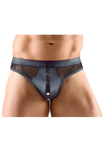 Un boxer diseñado para la afirmación masculina. Pieza en look rojo mate con detalles negros contrastantes, insertos de malla lateral y botones de presión en la bolsa para una experiencia BDSM audaz y cómoda.