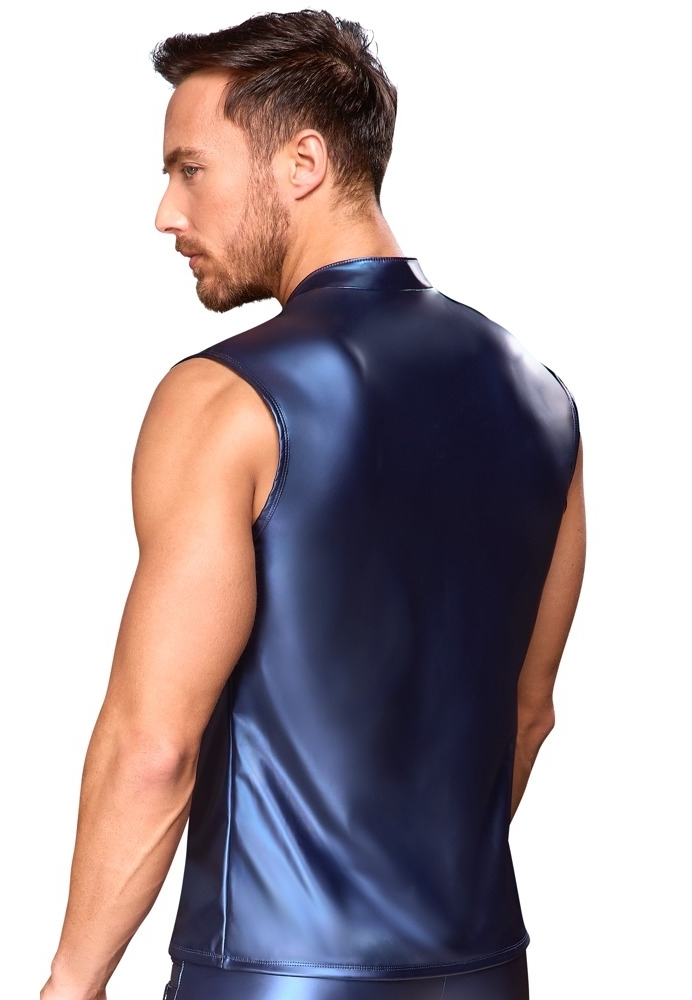 Un polo de cuero sintético rojo con cuello montante para una allure atlética y refinada. Pieza en cuero sintético elástico rojo con costuras verticales esculturales y detalles Alcantara de la marca Regnes Fetish Planet, diseño exclusivo fabricado en Europa.