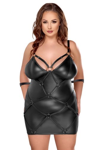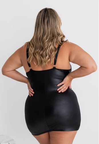 Este vestido fetiche de piel sintética y rejilla no renuncia a la intensidad con su provocativo corte skater y sus copas profesionales reforzadas.