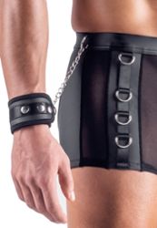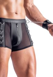 Ce boxer ouvert noir repousse les limites du bondage. Mix de résille et noir mat avec détails métalliques, fermeture éclair à la poche. Inclus : menottes souples avec chaînes. Anneaux de retenue au bund et sur les côtés, manches velcro réglables pour une exploration sensuelle maximale.