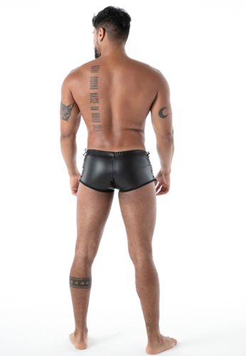 Le Kinky Bondage Boxer est un boxer long homme en datex effet cuir qui assume un style bondage, tout en restant confortable. Laçage frontal, coupe longue qui allonge la silhouette, et rabat amovible pour moduler le niveau de provocation : une pièce fetishwear forte, Made in France.