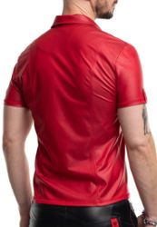 Un polo similicuir rouge avec col montant pour une allure athlétique et raffinée. Pièce en similicuir élastique rouge avec coutures verticales sculptantes et détails Alcantara de la marque Regnes Fetish Planet, design exclusif fabriqué en Europe.