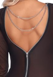 Le dos de la robe attire l'attention avec deux chaînes argentées amovibles ornant un profond décolleté en V.