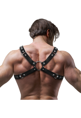 Um arnês de peito para homem em couro vegano, com duplo suporte e tachas para uma estrutura mais marcada e gráfica. Tamanho único e totalmente ajustável, define o torso com um fit premium e confortável.