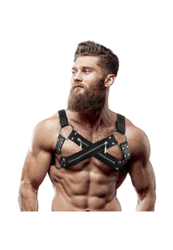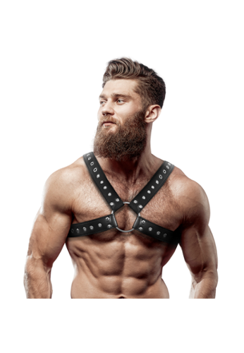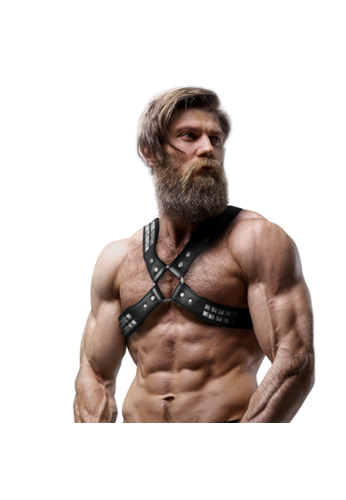 Um arnês de peito cross-over para homem em couro vegano, com tachas para mais textura e presença. Tamanho único e totalmente ajustável, o X marca o torso e cria um look premium, direto e muito visual.