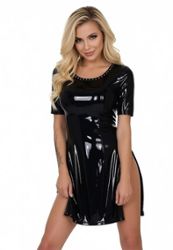 Un mini abito DateX con vero look latex: scollo profondo, maniche corte, zip laterali in colore a contrasto e dettaglio di borchie sullo scollo. Il taglio aderente valorizza le curve, con una vestibilità più facile grazie al materiale ibrido.