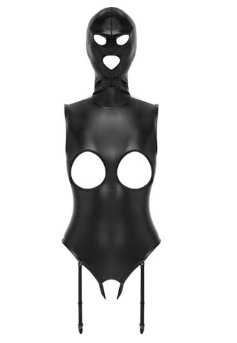 Questo body SM aperto rivela il vostro lato più stravagante grazie all'ecopelle nera elasticizzata e alla maschera integrata cucita.