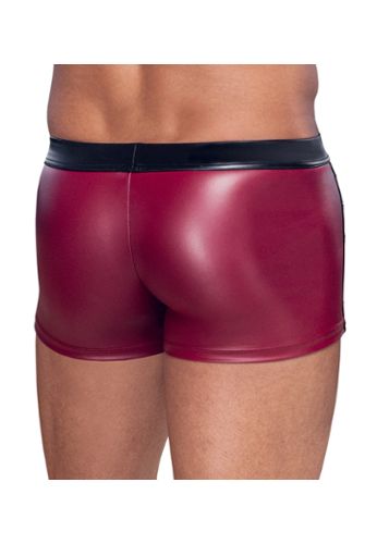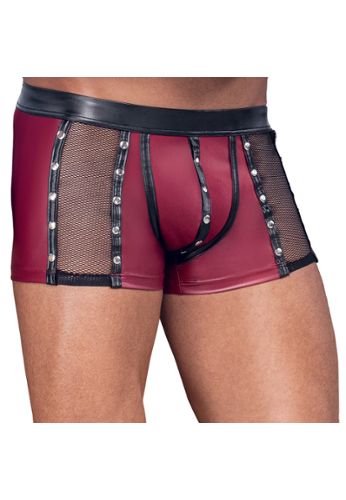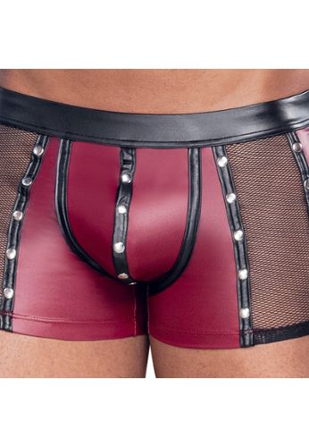 Een boxer ontworpen voor mannelijke affirmatie. Stuk in mat rood look met contrasterende zwarte details, zijdelingse netinzetten en drukknopen op de zak voor een gedurfd en comfortabel BDSM-ervaring.